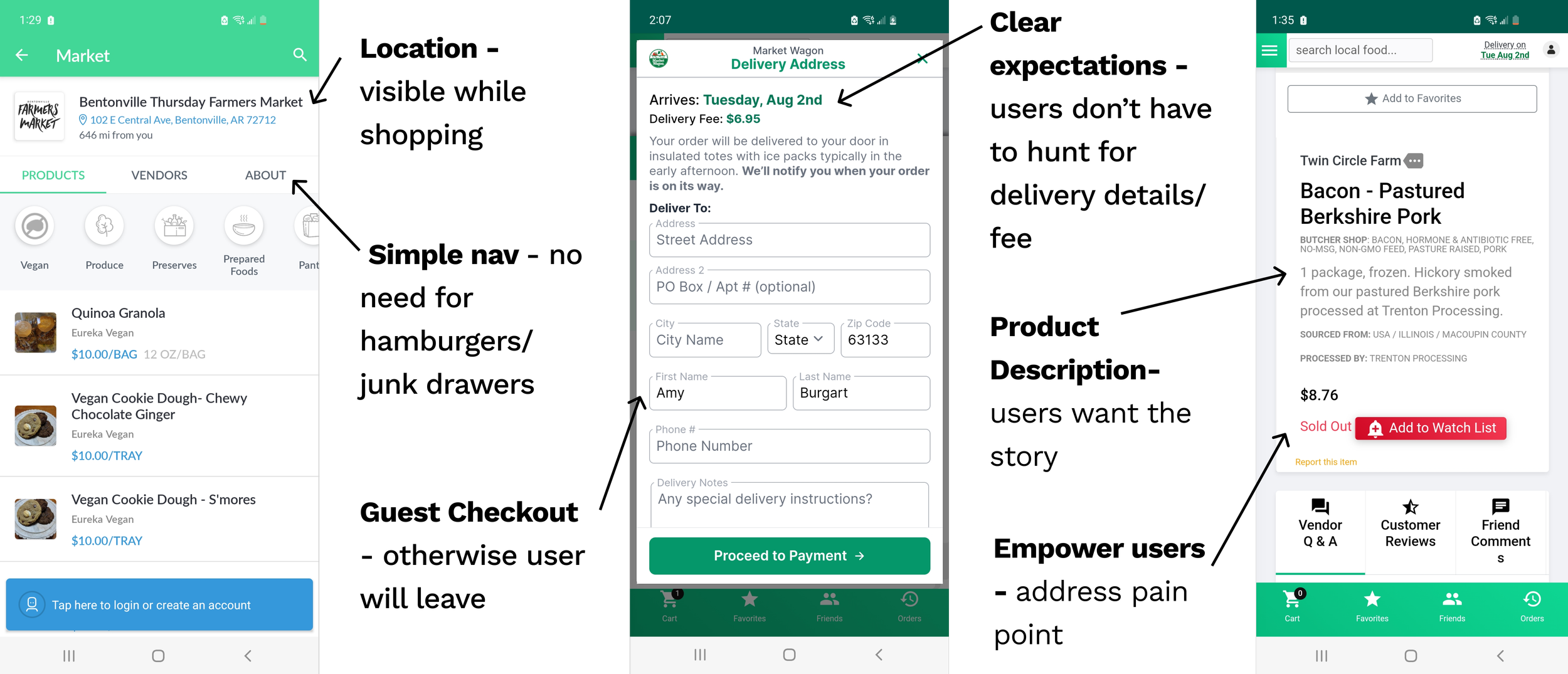 With user goals front of mind, I could validate or invalidate my assumptions about feature requirements. I was interested to learn that all 6 users preferred to browse all products so they didn’t miss out on hyperlocal or seasonal products they might not know about otherwise.